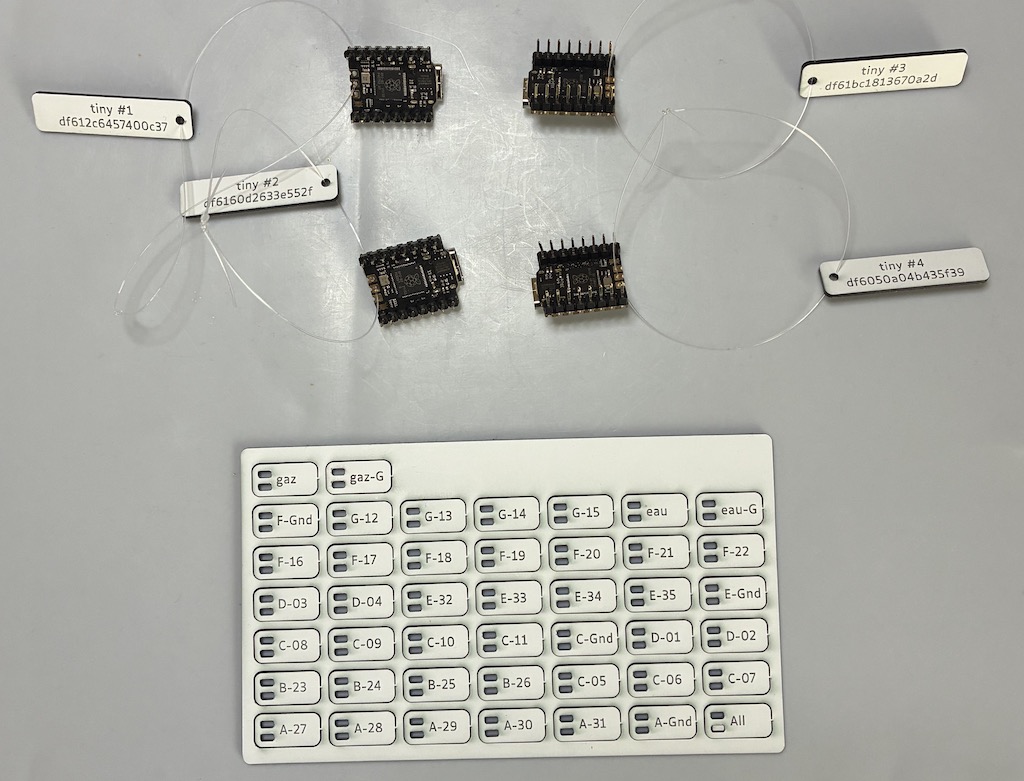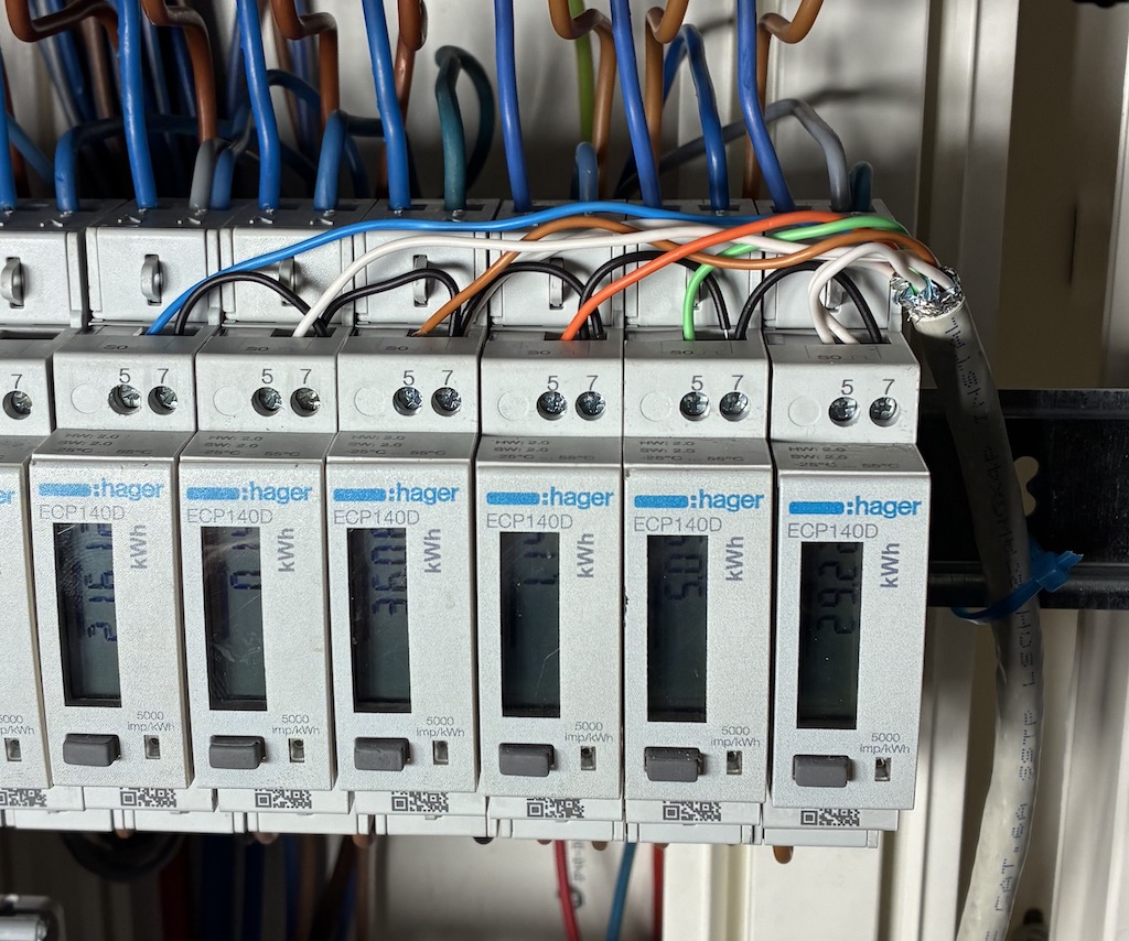 First intention was to use cat.6 Ethernet wires to link the meters to the tinys, gathering the tinys below. A first wiring was even realised that gave, at the top: